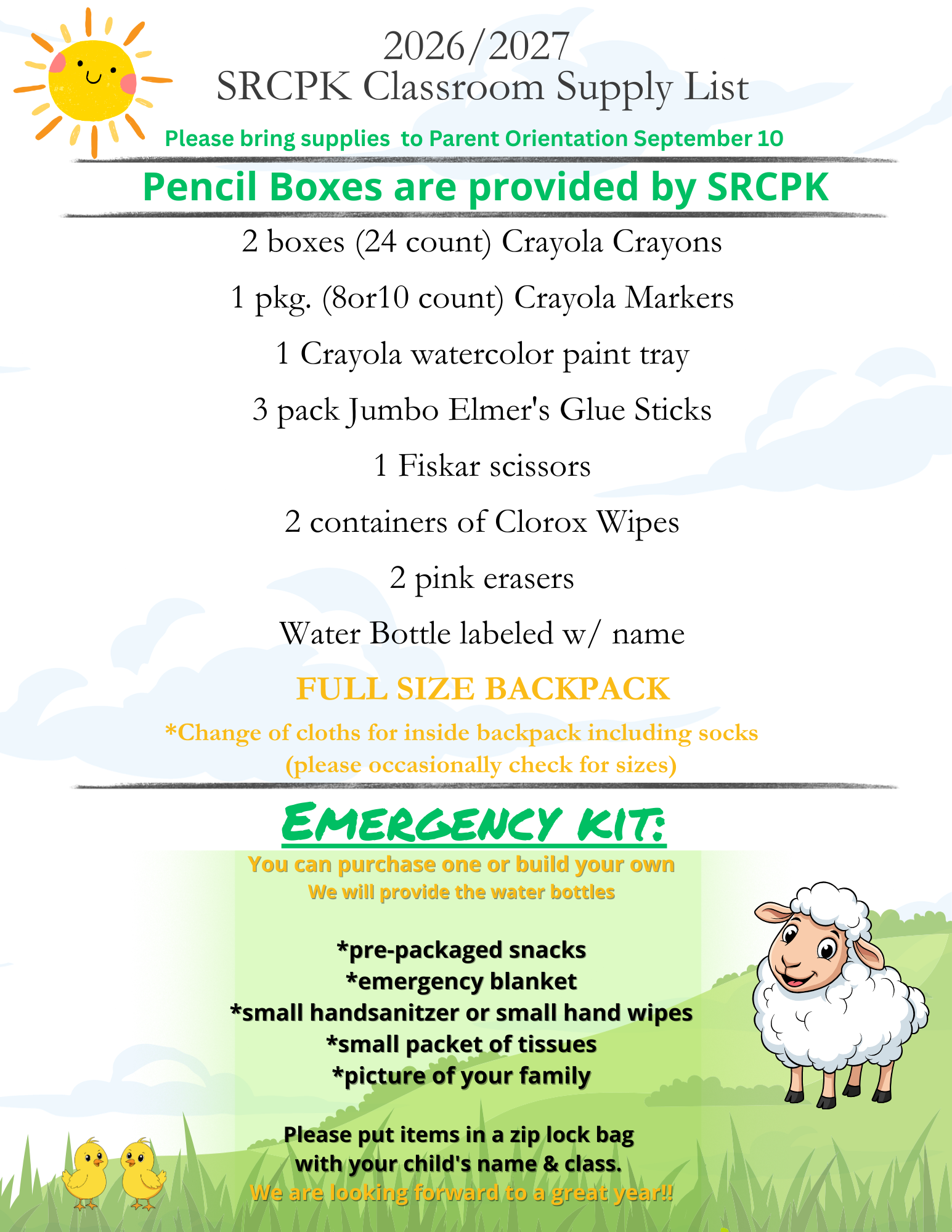 Please bring Supplies to the Parent Orientation on